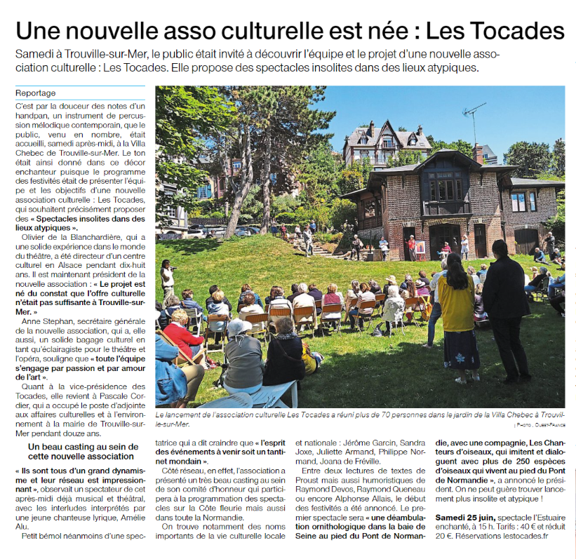 Venez nombreux découvrir l'association Les Tocades ! dans un cadre enchanteur à Trouville sur Mer. Vous pourrez ainsi partager un verre avec l'équipe enthousiaste et pleine d'idées qui anime ce nouveau projet culturel normand.